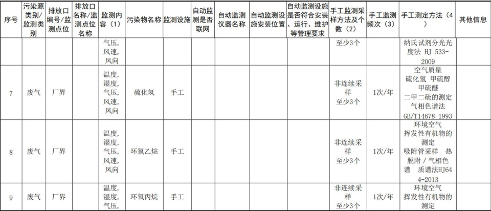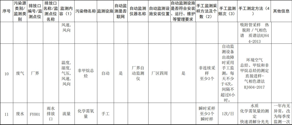 三、企業自行監測開展情況說明我公司自行監測手段采用手工監測+自動監測相結合,開展自動監測的項目有廢氣中的甲烷、非甲烷總烴及 VOC,其他未開展自動監測的項目采用手工監測。 我公司手工監測委托第三方檢測機構進行監測,監測內容包括有組織廢氣和無組織廢氣。